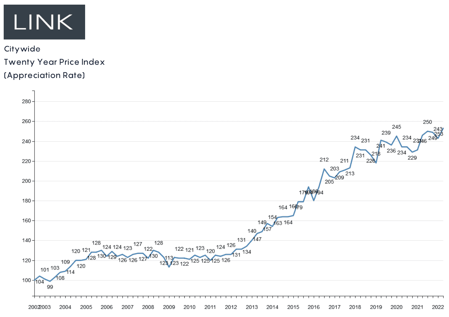 How is the Boston real estate market in 2022? LINK Boston's second quarter report shows that Boston's condo market is still strong. Condo values in many of Boston's core neighborhoods (which LINK refers to as "Citywide") remain high, which is illustrated in the 20 year price index (appreciation rate) chart.